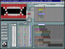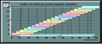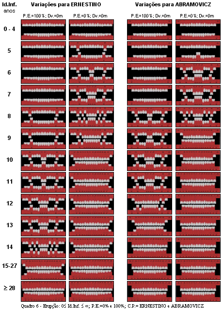 Quadro 2 - Legenda de cores dos dentes para a representação gráfica dos In.E. 5.3.8 - Variação dos Estados Eruptivos pela idade - V.E.E.Id.Inferindo-se uma idade de 15 anos e um P.E. em 50%, de acordo com a tabela de ERNESTINO, todos dos dentes estariam erupcionados, exceto os terceiros molares. Porém, basta alterar o P.E. para 75%, que os caninos, segundos pré-molares, segundos e terceiros molares não estariam erupcionados. Portanto, para Id.E. = 13 anos, do ponto de vista eruptivo, segundo ERNESTINO, apenas os dentes incisivos e primeiros molares estariam certamente erupcionados, assim como somente os terceiros molares estariam certamente não erupcionados. Em outras palavras, para a idade de 13 anos, temos 16 dentes com a variável erupção definida, e outros 16 como variável indefinida. Os cálculos são realizados sem considerar eventual correlação entre dentes, como por exemplo, a tendência de todos apresentarem conjuntamente precocidade, normalidade ou retardo eruptivo. 5.3.9 - Gráfico da variação dos Estados Eruptivos pela Idade -G.V.E.E.Id.Este índice de variação de erupção depende da idade, podendo-se construir um gráfico para cada tabela eruptiva, inclusive para as acrescentadas ao banco de dados. As tabelas eruptivas podem ter G.V.E.E.Id. comparados entre si. Pode-se comparar da mais variadas formas gráficas, dependendo de quantas tabelas se dispuser no banco de dados. As oito últimas tabelas e respectivas cores utilizadas estarão presentes como legenda. Quando alguma tabela que não apresente valores válidos para os terceiros molares é carregada, automaticamente estes dentes se tornam desativados do SISCRO. A plotagem do gráfico pode ser ajustada verticalmente em sua origem Y0 e na porcentagem em relação à área disponível Y%, de forma a permitir várias combinações como quatro gráficos simultâneos de 25% de amplitude vertical, dois de 25% e um de 50%, um de 75% e outro de 25%, dois de igual amplitude, ou apenas um, ocupando toda a área de plotagem. O controle horizontal é realizado na origem da marcação do gráfico X0, que varia em unidade de 0 a 12 meses e serve para plotagens intercaladas. A freqüência na idade para a marcação dos pontos pode ser estipulada em meses inteiros de 1 a 12, serve para uma construção menos densa, mais rápida ou intercalada, variando-se a origem X0. A plotagem em si pode ser realizada, utilizando-se pontos, barras verticais ou círculos de diâmetros definidos pelo usuário. As cores de cada plotagem também podem ser escolhidas pelo usuário, através da combinação de três cores básicas aditivas: vermelho, verde e ciano. Este recurso de cor, conhecido como "RGB", permite individualizar graficamente cada tabela ou grupos de dentes. A comparação entre as diversas tabelas pode ser realizada de forma numérica e gráfica, utilizando-se o comparador, uma segunda tabela em uma base de dados, diferente das tabelas de trabalho. Pode-se copiar qualquer tabela de trabalho para o comparador, ou introduzir novas tabelas, através do banco de dados. A representação iconográfica da variação dos estados eruptivos para a idade de 13 anos, segundo "ERNESTINO", considerando apenas a seqüência pré-determinada é de quatro figuras. Caso a seqüência não seja rígida, na situação real, teríamos 65.536 possibilidades. O cálculo da Id.Est. por determinada tabela é a resultante da união entre os In.PréE./In.PósE. para cada um dos dentes utilizados.