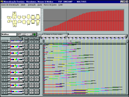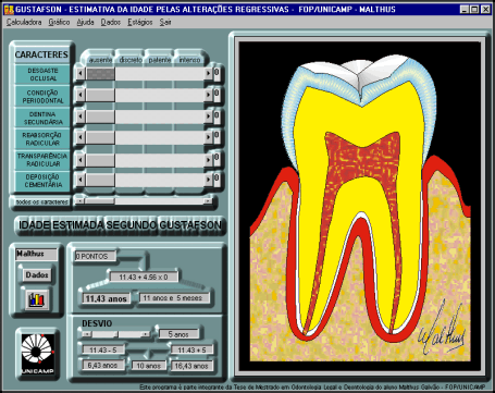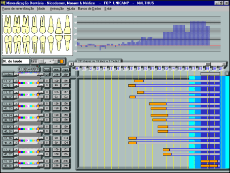 A descrição da metodologia deste trabalho, por sua natureza, se confunde, em algumas partes, com resultados, sendo neste título descritas. Foi utilizado um microcomputador portátil "Compaq Presário 1688", com freqüência interna de processador em 400 MHZ, arquitetura "AMD K6 II", memória de acesso randômico de 64 Mb, memória de disco rígido de 4,9 Gb, tela de matriz ativa de 13.1', resolução de 1024x768 "pixels", profundidade de cor de 32bites "true color", periféricos "Floppy Disk 1,38Mb", "Super disk 100Mb", "CDR drive 24x 650 Mb", "CDR Writter HP 8100" e "Zip Iômega disk 98Mb". Foi utilizado o sistema operacional "Microsoft Windows 98", e os aplicativos "Microsoft Visual Basic 6.0", "Microsoft Access 97", "Microsoft Excell 97", "Microsoft PhotoEditor", "Corel Photopaint 8.0" e Corel Draw 8.0". Todos estes nomes de programas citados são marcas registradas dos respectivos fabricantes. As tabelas e equações foram codificadas, utilizando-se linguagem de programação voltada ao objeto "Microsoft Visual Basic 6.0", criando-se interfaces gráficas interativas e amigáveis, com instruções na tela, voltadas ao usuário com mínimos conhecimentos de ambiente operacional iconográfico. Criou-se formulários eletrônicos para cada caracter: mineralização, erupção e alterações regressivas. Paralelamente, foram criados formulários avançados com representação gráfica das peculiaridades de cada tabela ou equação. Todos os registros foram acoplados a um banco de dados modelado em Microsoft Access 97. Foram utilizadas as tabelas de NICODEMOS MORAES e MÉDICE e equações de SALIBA, para mineralização dos dentes permanentes, tabelas de ERNESTINO, LOGAN, AREY, ABRAMOVICZ, DE GARN e ARBENZ para erupção dentária permanente e decídua, equação de GUSTAFSON e equações de CAMARGO para alterações dentárias regressivas. O conhecimento acerca da cronologia dos fenômenos fisiológicos e suas variações permitem, com certo grau de precisão, duas afirmações baseadas em observações e estudos: A partir de uma idade conhecida, pode-se prever, de acordo com as tabelas e equações, as diversas características prováveis para cada um dos fenômenos fisiológicos dentários. A partir do conhecimento das características de cada um dos fenômenos fisiológicos dentários, pode-se estimar a idade provável do indivíduo. O funcionamento do sistema computadorizado, SISCRO, em termos de programação, foi checado, inferindo-se dados peculiares, consistindo em progressões aritméticas simples, para facilidade de validação dos resultados. 5 - Resultados 5.1 - SISCRO 5.1.1 - Idade estimada - Id. Est. Intervalo de idade que o SISCRO retorna para determinado conjunto de estágios de mineralização, de erupção ou de alterações regressivas conhecidas. O usuário informa o estado eruptivo de cada elemento dentário, clicando diretamente em sua imagem, e definindo se o mesmo será incluído nos cálculos. A Id.Est. pode ser calculada simultaneamente por seis tabelas, resultando numérica e graficamente em valores mínimos e máximos de cada uma, a interseção e união de seus intervalos e a média dos mínimos e dos máximos e seus respectivos desvios-padrão. No caso da mineralização, o SISCRO retorna para cada elemento dentário, gráfica e numericamente, o E.M. e o respectivo In.E.M., além de suas interseções. O estudo das alterações regressivas, segundo equação preconizada por GUSTAFSON, retorna idades fracionárias, à razão de 4,56 , a partir de 11,43. Este resultado pontual pode ser automaticamente representado por um intervalo de idade, com a utilização de um desvio, que pode ser inferido entre 0 a 10 anos, tendo como unidade 0,01 anos. O cálculo da idade pela área da câmara pulpar retorna um valor fracionário em anos, em função dos coeficientes das equações. 5.1.2 - Idade inferida - Id.Inf.Idade que se oferece ao SISCRO, para que o mesmo retorne os estágios dentários de mineralização, eruptiva e das alterações regressivas. Situações em que sabemos a idade do indivíduo e seja necessário supor suas condições dentárias. Para os fenômenos de mineralização e eruptivos, a idade inferida foi considerada como variável discreta, tendo um mês como unidade. Foi representada graficamente de 0 a 250 meses, para os fenômenos da mineralização e de 0 a 360 meses, para os fenômenos eruptivos. O estudo das alterações regressivas, segundo equação preconizada por GUSTAFSON, permite idades fracionárias, em uma progressão aritmética com razão 4,56, seu coeficiente angular, a partir de 11,43, seu coeficiente linear. 5.1.3 - Banco de dados A base de dados é constituída de sete tabelas básicas, acessíveis pelo SISCRO ou pelo programa "Microsoft Access 97". Tabela 1 - Tabelas do SISCRO