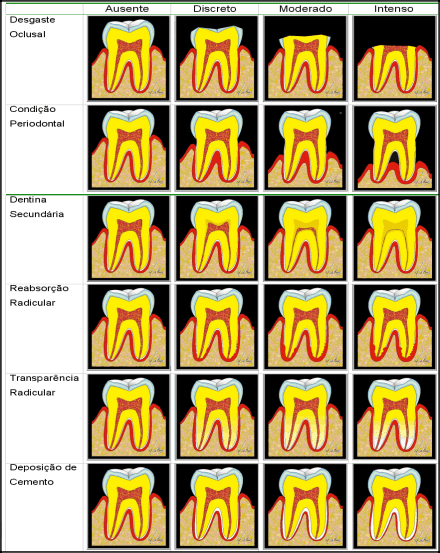 A equação proposta por GUSTAFSON é do primeiro grau, linear, relacionando a idade à soma aritmética de seis variáveis. Idade = 11,43 + (4,56 * å variáveis) As variáveis participam com o mesmo peso na equação, pois a mesma utiliza apenas o montante. Cada variável pode assumir os valores: "0", "1", "2" e "3", ou seja, o conjunto domínio da função para cada variável Conjunto-Domínio = {xÎ N / 0 £ x £ 3} Conjunto-Domínio do Somatório = { x Î N / 0 £ x £ 18}As seis variáveis que compõem a equação de GUSTAFSON são definidas abaixo.