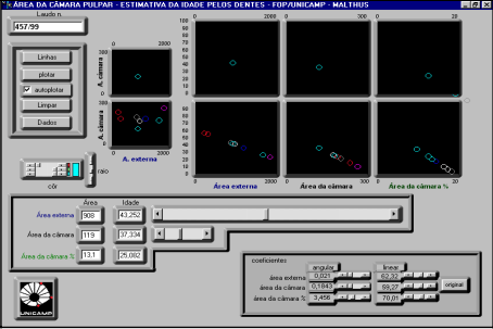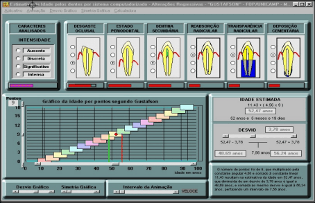 Estas variáveis podem ser inferidas pelo usuário, através de barras de rolagem. A rotina de cálculo é realizada automaticamente, após a alteração de qualquer variável, sendo dispensável o "botão" de comando para calcular. Isto permite que, enquanto a barra de rolagem está sendo deslizada, os resultados sejam atualizados, assim como o gráfico. Os coeficientes lineares e angulares aplicados pelo programa podem ser definidos pelo usuário, através de seis barras de rolagem. Os coeficientes angulares podem variar de 0 a 10, em frações milesimais, enquanto, que os coeficientes lineares podem variar de 0 a 100, em frações centesimais. O SISCRO inicia com os coeficientes propostos por CAMARGO, 1994. Coeficientes lineares = C.Lin. Coeficientes angulares = C.Ang. Área percentual = (Área da câmara/Área externa)*100 Idade = C.Lin. + ( C.Ang. * Área) Idade(área da câmara) = C.Lin. + ( C.Ang. * Área da câmara) Idade(área externa) = C.Lin. + ( C.Ang. * Área externa) Idade(área percentual) = C.Lin. + ( C.Ang. * Área percentual) As cores das plotagens, assim como o diâmetro da circunferência utilizada pelo gráfico, podem ser alterados pelo usuário. Estas informações ficam armazenadas, juntamente com os registros de cada um dos laudos, permitindo que os mesmos, em séries distintas, possam ser comparados graficamente. Cada variável de cor do sistema RGB admite 256 opções, sendo três: 16.777.216 no total. Ativando-se o comando "autoplotar", e variando-se a área da câmara e a externa, constrói-se as retas das funções. Percorrendo-se a lista de laudos, seus resultados gráficos se sobrepõem. O resultado básico do SISCRO são suas possibilidades de aplicação, sobrepondo-se a algum exemplo de sua utilização, pois são, teórica e praticamente, infinitos. O ponto fundamental foi a tradução, em termos matemáticos, e posteriormente em linguagem de programação, dos princípios básicos periciais, onde a exceção pode ter tanto ou mais valor que a regra. O exemplo mais clássico, para entendimento do SISCRO, é a utilização simultânea de até seis tabelas eruptivas diferentes, tendo como resultado final, a união das mesmas, considerando todas as possibilidades. Inferindo-se uma idade, o SISCRO retorna todas as possibilidades eruptivas, acordando com a tabela eruptiva em análise. Este é o raciocínio pericial. Muitas vezes, peritos consideram que exista a "determinação" dos estados eruptivos, sendo que na realidade, consegue-se a "estimativa" dos diversos estados eruptivos possíveis, para aquela determinada idade, segundo determinado autor. Os livros fornecem tabelas, relacionando idade com os estados eruptivos, enquanto o SISCRO fornece possibilidades eruptivas. Os resultados obtidos apresentam aplicação imediata em perícias, possibilitando uma análise global e rápida das características dentárias. A possibilidade de visualização gráfica dos valores numéricos e cálculos torna o SISCRO um valoroso instrumento didático, transmitindo o princípio do raciocínio odontológico legal. O acoplamento do SISCRO ao banco de dados, que permite a inclusão de novas tabelas e equações, possibilita a aplicação em pesquisa, comparando parâmetros existentes atual e futuramente, além de possibilitar a comparação entre séries de registros de laudos. 7 - Conclusão Os resultados, principalmente comparativos, suplantaram as expectativas iniciais, consistindo o SISCRO em uma poderosa ferramenta, com possibilidades ilimitadas. A estimativa da idade pela mineralização dentária encontra maiores subsídios na fase em que a curva do G.S.E.M.Id. encontra-se mais verticalizada ou quando o G.V.Id.E.M. apresenta os menores valores absolutos, sem levar em conta a evolução da curva. Observa-se uma diminuição significativa da inclinação do G.S.E.M.Id. , a partir de 11 anos de idade. Graficamente se observa que entre 6 e 7 anos, a diferença na soma do número dos E.M. é bem superior à encontrada entre 11 e 12, ou seja, a probabilidade de uma estimativa de idade neste E.M. é bem mais precisa. São mais eventos acontecendo por unidade de tempo. Os valores negativos encontrados no G.V.Id.E.M. correspondem a hiatos na tabela de N.M.M., idades não previstas, mais uma justificativa destinada a dar elasticidade à interpretação dos dados, proporcionando uma flexibilização, através da utilização dos tabuladores. Existem hiatos entre os In.E.M., como na idade de 3,5 anos para os dentes 14 e 24. O G.V.Id.E.M. nada mais é que a plotagem do valor da diferença obtida com um tabulador, com margem definida em "0". Quando o valor é negativo, existe pelo menos um hiato para algum grupo de dentes nesta idade, o que pode ser visualizado no gráfico dos hiatos. O In.E.M.=0 engloba, em todos os grupos de dentes, o In.E.M.=1, pois no raciocínio médico legal, o Id.E.M=0 se estende até o extremo do In.E.M.=1. O início da mineralização poderia ocorrer tardiamente. O G.V.Id.E.M., construído utilizando-se as equações de SALIBA pela seqüência dos E.M. segundo N.M.M. demonstra a quase inexistência de interseções. O assincronismo com a tabela de N.M.M. é bastante evidente. A ilustração a ser utilizada na cronologia de erupção dentária deve seguir o proposto por este trabalho, variando o P.E. dentro do definido pelo usuário, ou seja: para a idade de 8 anos, teríamos duas ilustrações, uma para a mínima erupção e outra para a máxima. O acoplamento do sistema ao banco de dados tornou o sistema utilizável como ferramenta auxiliar em pesquisas estatísticas e conseqüente desenvolvimento do próprio sistema. Em diversas situações a idade calculada é um resultado impossível, reflexo da incongruência das informações dentárias com a tabela ou equação utilizadas. O SISCRO, finalmente, não coloca a estimativa da idade pelos dentes em pedestal intocável, muito pelo contrário, demonstra suas incongruências e a necessidade da utilizaçã