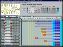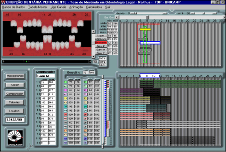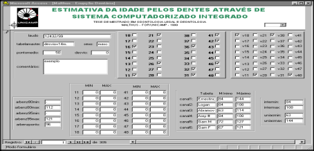 A descrição da metodologia deste trabalho, por sua natureza, se confunde, em algumas partes, com resultados, sendo neste título descritas. Foi utilizado um microcomputador portátil "Compaq Presário 1688", com freqüência interna de processador em 400 MHZ, arquitetura "AMD K6 II", memória de acesso randômico de 64 Mb, memória de disco rígido de 4,9 Gb, tela de matriz ativa de 13.1', resolução de 1024x768 "pixels", profundidade de cor de 32bites "true color", periféricos "Floppy Disk 1,38Mb", "Super disk 100Mb", "CDR drive 24x 650 Mb", "CDR Writter HP 8100" e "Zip Iômega disk 98Mb". Foi utilizado o sistema operacional "Microsoft Windows 98", e os aplicativos "Microsoft Visual Basic 6.0", "Microsoft Access 97", "Microsoft Excell 97", "Microsoft PhotoEditor", "Corel Photopaint 8.0" e Corel Draw 8.0". Todos estes nomes de programas citados são marcas registradas dos respectivos fabricantes. As tabelas e equações foram codificadas, utilizando-se linguagem de programação voltada ao objeto "Microsoft Visual Basic 6.0", criando-se interfaces gráficas interativas e amigáveis, com instruções na tela, voltadas ao usuário com mínimos conhecimentos de ambiente operacional iconográfico. Criou-se formulários eletrônicos para cada caracter: mineralização, erupção e alterações regressivas. Paralelamente, foram criados formulários avançados com representação gráfica das peculiaridades de cada tabela ou equação. Todos os registros foram acoplados a um banco de dados modelado em Microsoft Access 97. Foram utilizadas as tabelas de NICODEMOS MORAES e MÉDICE e equações de SALIBA, para mineralização dos dentes permanentes, tabelas de ERNESTINO, LOGAN, AREY, ABRAMOVICZ, DE GARN e ARBENZ para erupção dentária permanente e decídua, equação de GUSTAFSON e equações de CAMARGO para alterações dentárias regressivas. O conhecimento acerca da cronologia dos fenômenos fisiológicos e suas variações permitem, com certo grau de precisão, duas afirmações baseadas em observações e estudos: A partir de uma idade conhecida, pode-se prever, de acordo com as tabelas e equações, as diversas características prováveis para cada um dos fenômenos fisiológicos dentários. A partir do conhecimento das características de cada um dos fenômenos fisiológicos dentários, pode-se estimar a idade provável do indivíduo. O funcionamento do sistema computadorizado, SISCRO, em termos de programação, foi checado, inferindo-se dados peculiares, consistindo em progressões aritméticas simples, para facilidade de validação dos resultados. 5 - Resultados 5.1 - SISCRO 5.1.1 - Idade estimada - Id. Est. Intervalo de idade que o SISCRO retorna para determinado conjunto de estágios de mineralização, de erupção ou de alterações regressivas conhecidas. O usuário informa o estado eruptivo de cada elemento dentário, clicando diretamente em sua imagem, e definindo se o mesmo será incluído nos cálculos. A Id.Est. pode ser calculada simultaneamente por seis tabelas, resultando numérica e graficamente em valores mínimos e máximos de cada uma, a interseção e união de seus intervalos e a média dos mínimos e dos máximos e seus respectivos desvios-padrão. No caso da mineralização, o SISCRO retorna para cada elemento dentário, gráfica e numericamente, o E.M. e o respectivo In.E.M., além de suas interseções. O estudo das alterações regressivas, segundo equação preconizada por GUSTAFSON, retorna idades fracionárias, à razão de 4,56 , a partir de 11,43. Este resultado pontual pode ser automaticamente representado por um intervalo de idade, com a utilização de um desvio, que pode ser inferido entre 0 a 10 anos, tendo como unidade 0,01 anos. O cálculo da idade pela área da câmara pulpar retorna um valor fracionário em anos, em função dos coeficientes das equações. 5.1.2 - Idade inferida - Id.Inf.Idade que se oferece ao SISCRO, para que o mesmo retorne os estágios dentários de mineralização, eruptiva e das alterações regressivas. Situações em que sabemos a idade do indivíduo e seja necessário supor suas condições dentárias. Para os fenômenos de mineralização e eruptivos, a idade inferida foi considerada como variável discreta, tendo um mês como unidade. Foi representada graficamente de 0 a 250 meses, para os fenômenos da mineralização e de 0 a 360 meses, para os fenômenos eruptivos. O estudo das alterações regressivas, segundo equação preconizada por GUSTAFSON, permite idades fracionárias, em uma progressão aritmética com razão 4,56, seu coeficiente angular, a partir de 11,43, seu coeficiente linear. 5.1.3 - Banco de dados A base de dados é constituída de sete tabelas básicas, acessíveis pelo SISCRO ou pelo programa "Microsoft Access 97". Tabela 1 - Tabelas do SISCRO